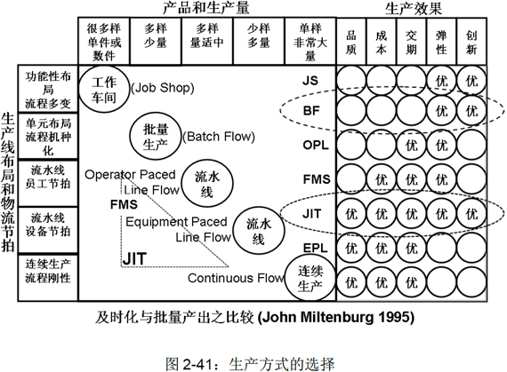 流程设计需要考虑的事项很多,首先要决定生产方式、生产线的布局和物流节拍。其他的还包括如何缩短换线时间,是否能小批量生产,因为小批量生产具有弹性又可使问题凸显,物料移动的方向和距离等。下图2-41是生产方式选择的矩阵图,也比较了批量生产和及时化生产的优劣。单元布局或最有效率的流水线不是唯一的选择,重点还是要考虑自己的产品、生产销售量、员工能力等因素。